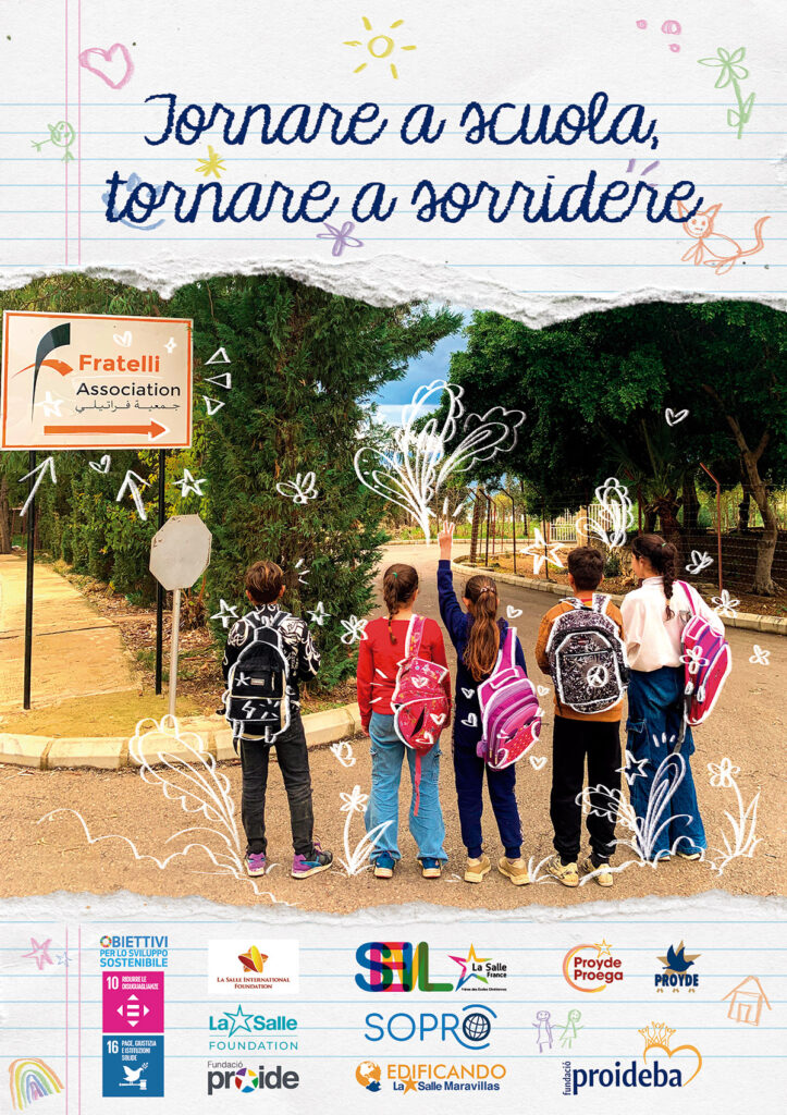 In linea con gli Obiettivi di Sviluppo Sostenibile (OSS), La Salle Foundation, insieme alle ONG Lasalliane del Distretto ARLEP — PROYDE, PROIDE, PROIDEBA, PROEGA e SOPRO —, propone la campagna “tornare a scuola, tornare a sorridere”, sottolineando la necessità di ridurre le disuguaglianze (OSS 10) e di promuovere pace, giustizia e istituzioni solide (OSS 16).