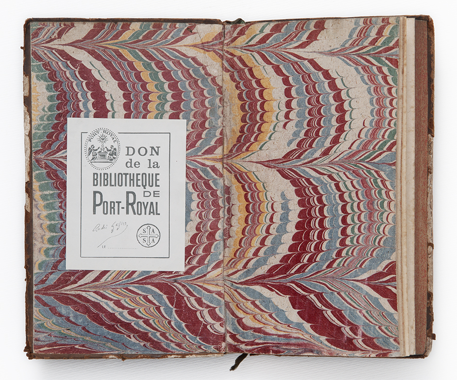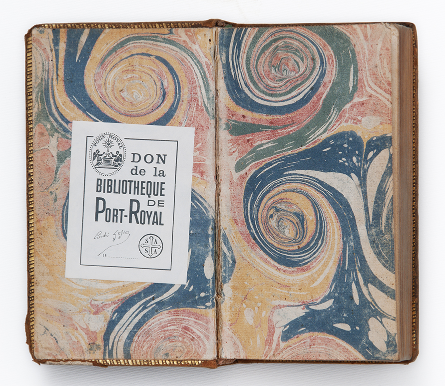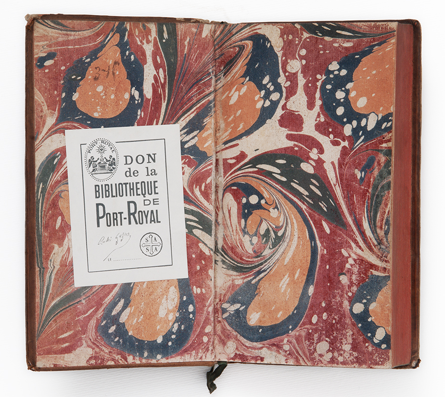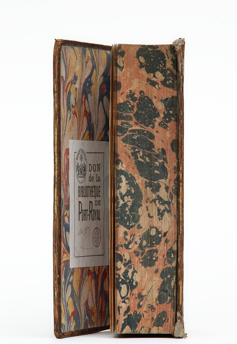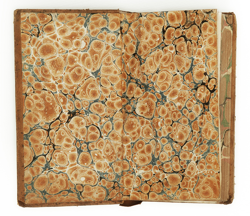 I libri della collezione Gazier-Martinais presentano caratteristiche comuni che riportano alla stessa epoca e allo stesso ambito di provenienza: sono rilegati in pelle di colore marrone oppure marmorizzata, cioè decorata con spruzzi di colore più scuro che richiama le venature del marmo. Sul dorso spicca il titolo o anche il nome dell’autore, in caratteri impressi in oro. I risguardi e le carte di guardia, cioè le pagine iniziali e finali non stampate poste a protezione del libro, sono finemente decorate con motivi fantasiosi o marmorizzati nei toni del blu, rosso, arancione, giallo. Anche i tagli, cioè i margini esterni delle pagine, a volte sono dipinti in un unico colore (generalmente rosso, azzurro, giallo), oppure marmorizzati; più raramente dorati.