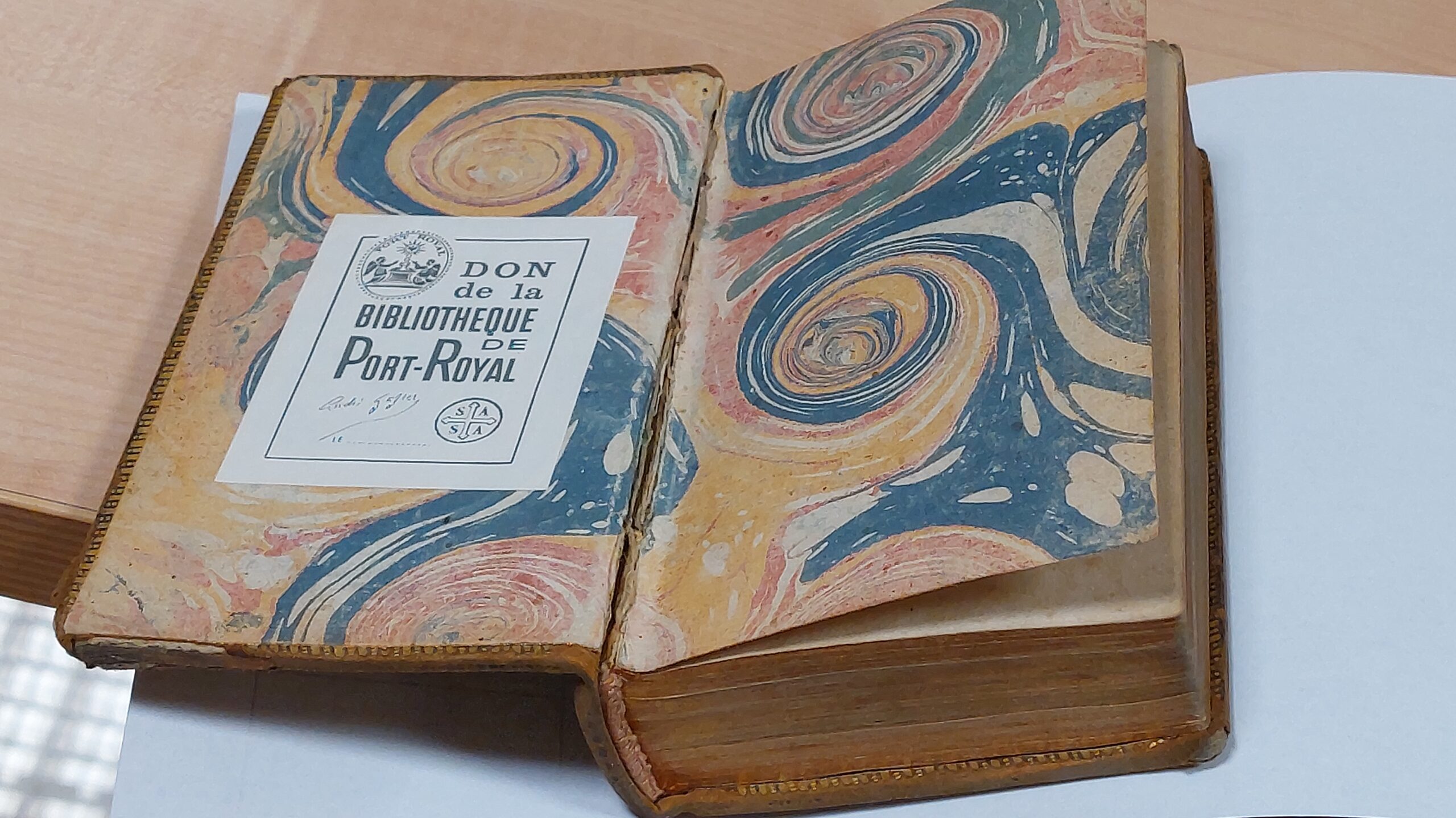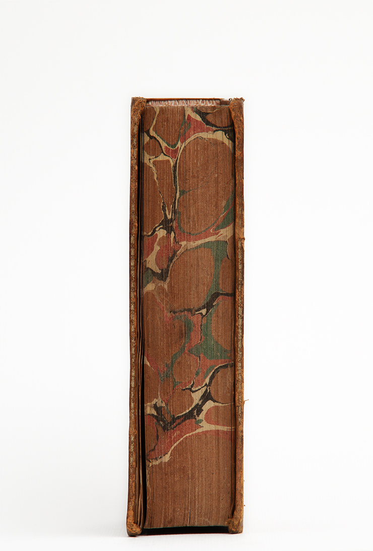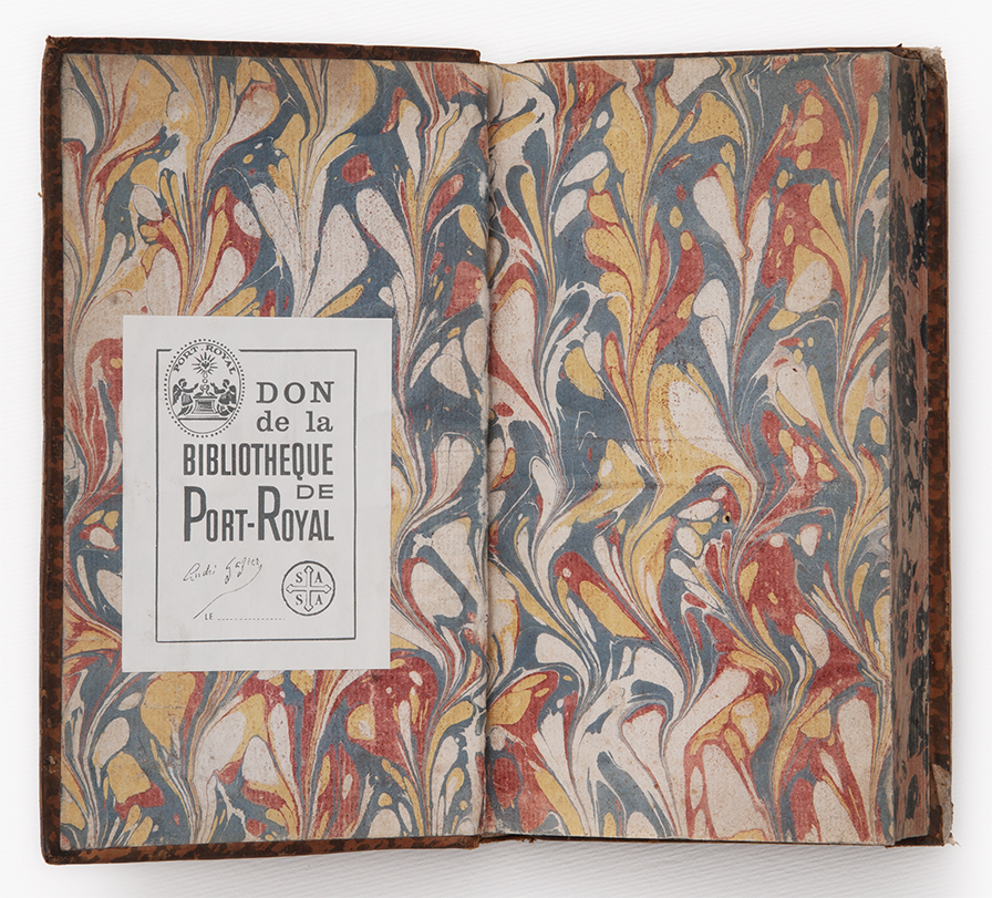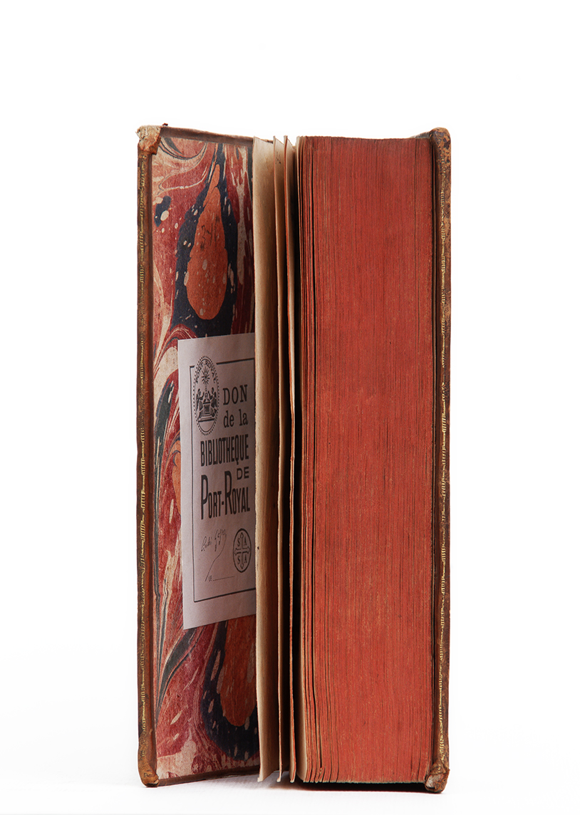 I libri della collezione Gazier-Martinais presentano caratteristiche comuni che riportano alla stessa epoca e allo stesso ambito di provenienza: sono rilegati in pelle di colore marrone oppure marmorizzata, cioè decorata con spruzzi di colore più scuro che richiama le venature del marmo. Sul dorso spicca il titolo o anche il nome dell’autore, in caratteri impressi in oro. I risguardi e le carte di guardia, cioè le pagine iniziali e finali non stampate poste a protezione del libro, sono finemente decorate con motivi fantasiosi o marmorizzati nei toni del blu, rosso, arancione, giallo. Anche i tagli, cioè i margini esterni delle pagine, a volte sono dipinti in un unico colore (generalmente rosso, azzurro, giallo), oppure marmorizzati; più raramente dorati.