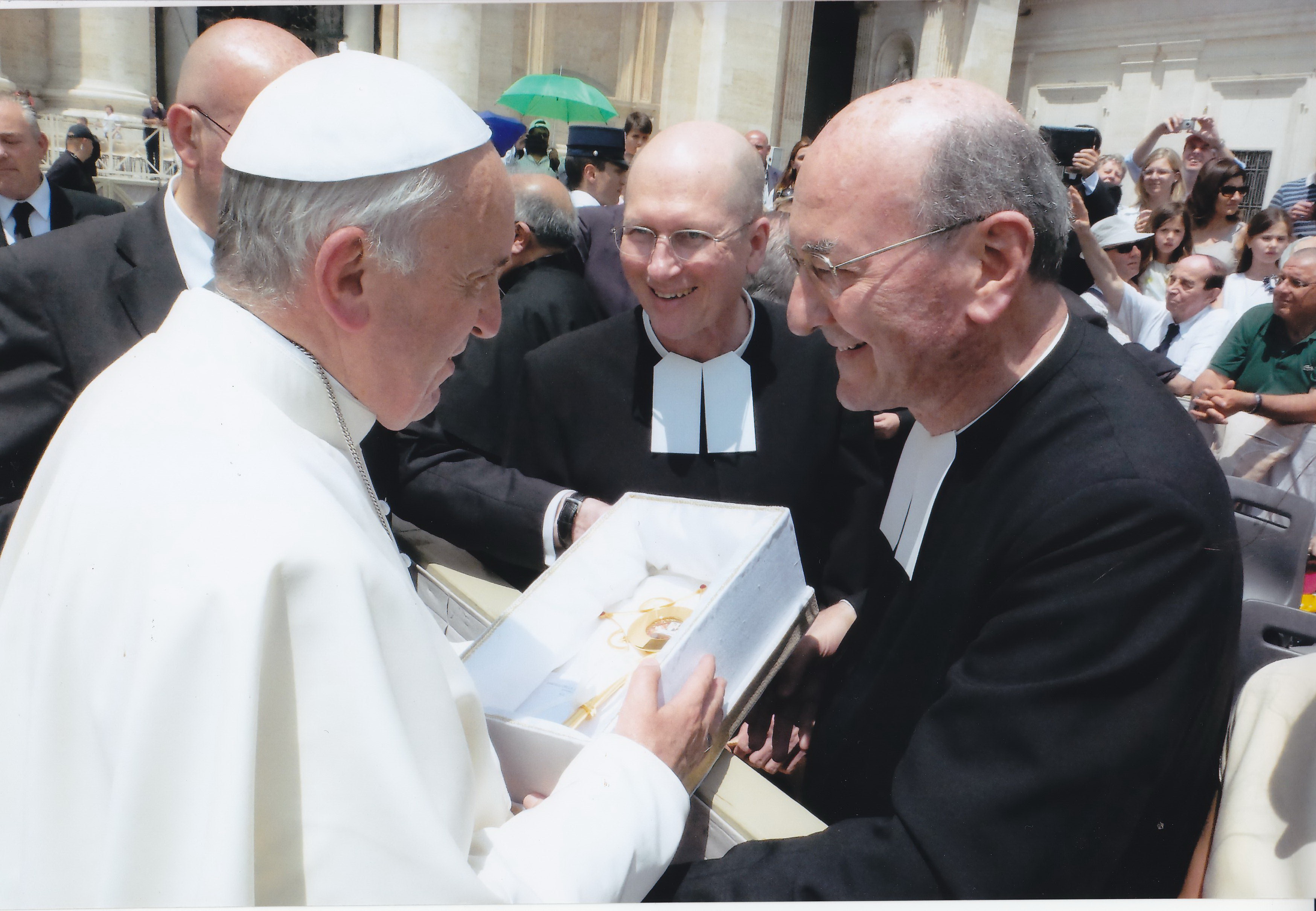 Los Hermanos Thomas Johnson y Rodolfo Meoli entregan una reliquia de San Héctor Valdivieso (Primer Santo Argentino) a su Santidad Papa Francisco.